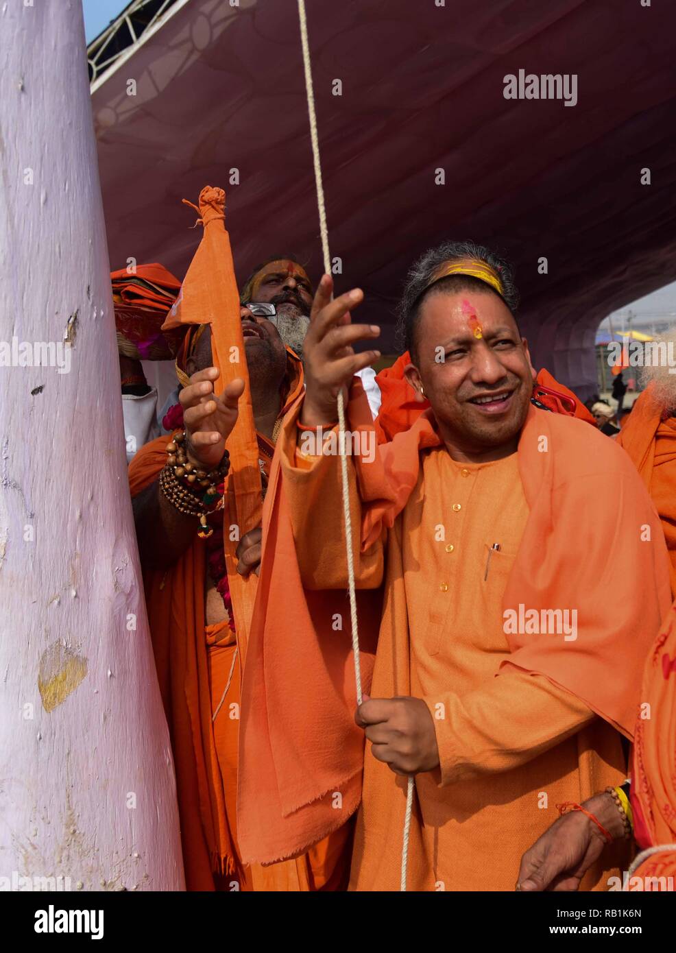 Allahabad India 05th Jan 2019 Allahabad Uttar Pradesh Chief Minister Aditya Nath Yogi Along With Akhara Parishad President Narendra Giri Jagadguru Swami Hansh Devacharya Ji Maharaj And Sadhus Take Part Part In Flag Hosting Ceremony Of Akhil